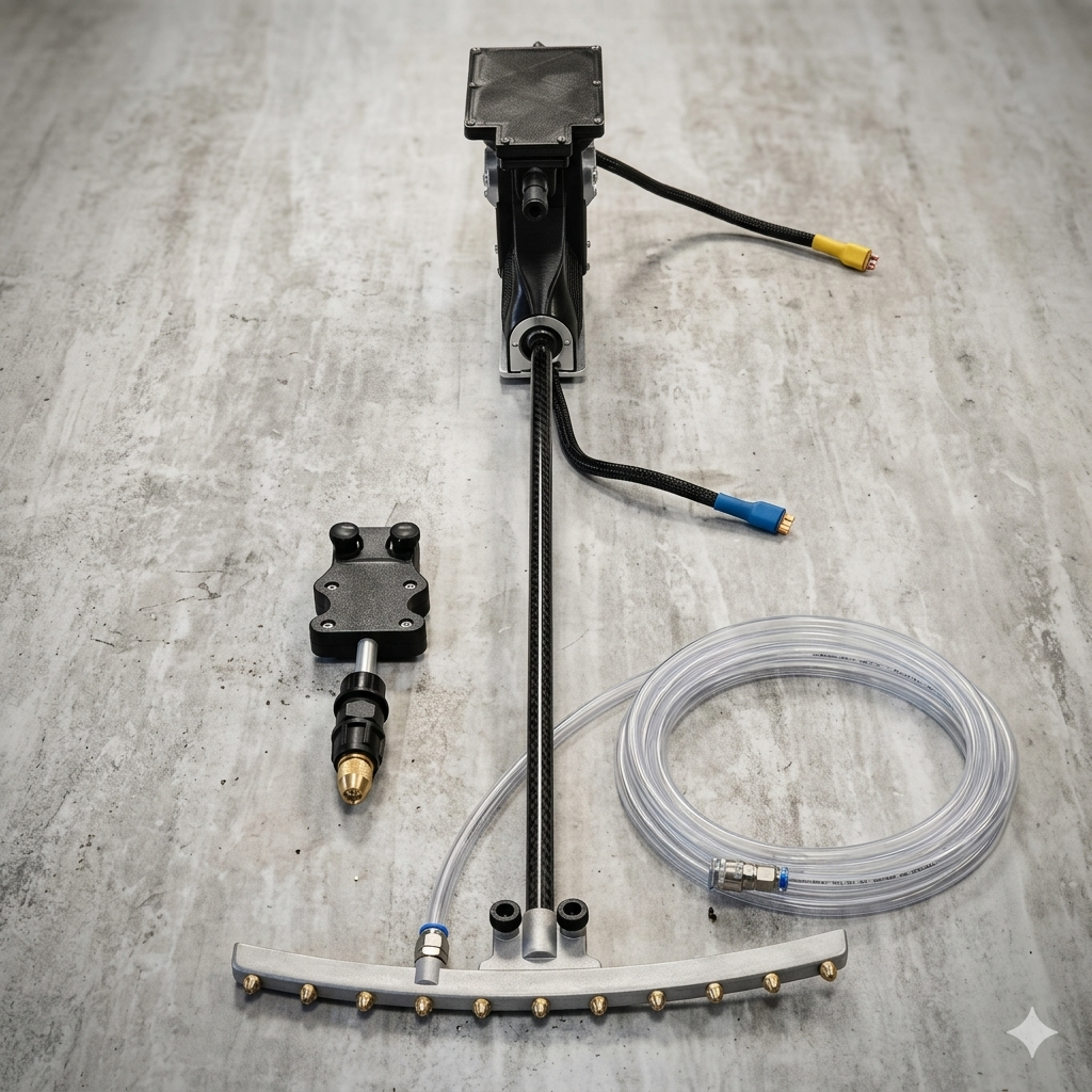 Perche orientable sur deux axes commandés par servomoteurs, construction aluminium sur roulements à billes. Étanche et résistante aux acides. Tube carbone Ø12mm, rampe multijets aluminium par frittage laser, module monobuse laiton longue portée 10m.